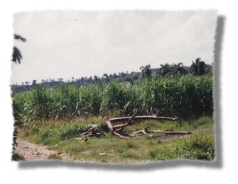 | Als erstes ging es quer durch die Zuckerrohrplantagen. Bei einem Fotostop konnten wir sogar das Zuckerrohr probieren - mhmm! Doch etwas holzig.. |