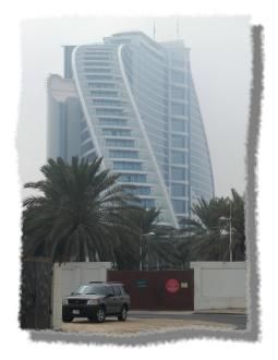 | Lediglich das Jumeirah Beach Hotel war im Nebel sichtbar, der wirklich beeindruckende Höhenunterschied wurde gar nicht deutlich. Denn von der Beach Road aus auf beide Hotels zukommend wirkt das riesige Beach-Hotel wie eine kleine Pension neben dem beeindruckenden Burj Al Arab. Die Weltkugel im Meer, bei freier Sicht auf dem Wasser zu erkennen, blieb uns leider auch verschlossen. |