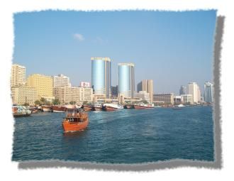 | Nahe des Radisson SAS Gebäudes sind wir ausgestiegen und haben die im Ticket eingeschlossene Dhow Creek Tour mitgemacht. In einer Stunde sind wir bis zur Mündung des Creeks am arabischen Golf, zurück bis fast zur Al Maktoum Bridge und wieder an den Anlegesteg zurück. Vom Boot aus hat man eine herrliche Sicht auf die Stadt und die Skyline des Geschäftsviertels auf der Deira Seite von Dubai. |